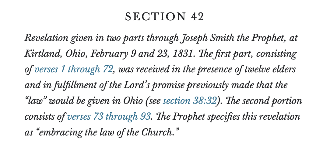 It shows up in the Doctrine and Covenants, in Section 42. As the heading explains, Section 42 is the fulfillment of the Lord’s earlier promise that His law would be given to the Church in Ohio. In other words, what follows isn’t commentary—it’s presented as God’s law.